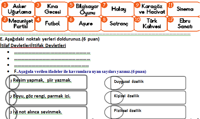 verilenlerden milli kültürümüze ait olanları belirleyip, numaralarını alttaki