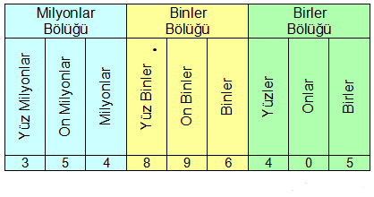 Aşağıdaki tabloda 9 basamaklı 354 896 405 sayısının basamak ve bölükleri gösterilmiştir.