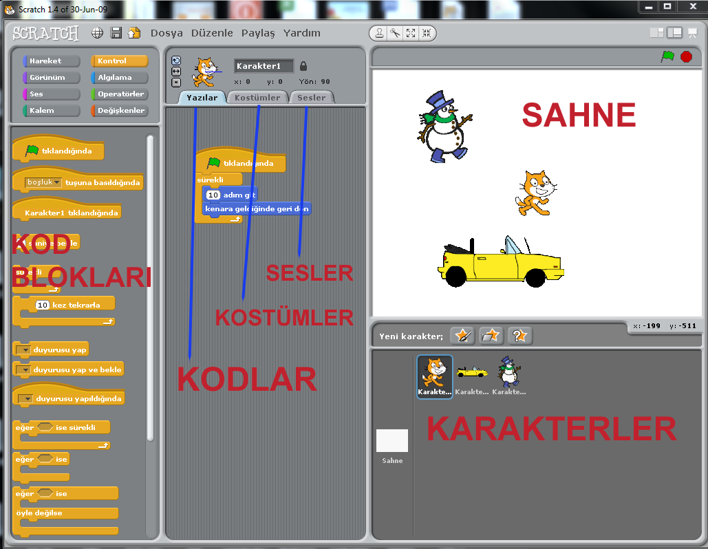 Sahneye eklenen karakterler seçilerek her birine ayrı ayrı kodlama yapılır. Karakter seçildikten sonra, sol tarafta görünen kod blokları sürüklenerek ortada bulunan alanda birleştirilerek program oluşturulur.