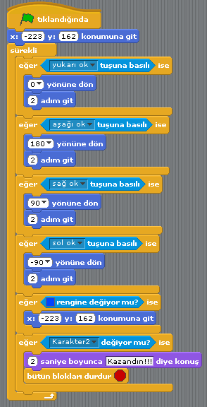 Yeşil bayrak düğmesiyle oyunumuz başlayacak. Bayrağın altındaki x ve y komutları, oyun başladığında karakterimizin, başlangıç noktasına gitmesi için kullanılıyor. Sürekli döngünün içindeki ilk dört “Eğer” komutu, karakteri yukarı, aşağı, sağa ve sola hareket ettirmek içindir. Beşinci “Eğer” komutu, duvarlara değerse, başladığı konuma gitmesi içindir. Altıncı “Eğer” komutu, Karakter2 ye, yani çıkış noktasındaki kapı karakterine değdiğinde oyunu bitirmek içindir.