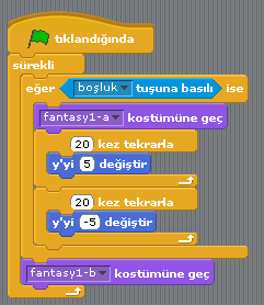 Programımızda, sürekli bir döngü içerisinde “Eğer” fonksiyonu kontrol ettiriliyor. Eğer boşluk tuşuna basıldıysa, karakter “fantasy1-a” kostümüne geçecek ve “y” konumu 20 kez, 5 adım artacak; sonra da aynı şekilde azalacak. En son tekrar “fantasy1-b” kostümüne geçecek. boşluk tuşuna basılmadığı sürece hep böyle kalacak.