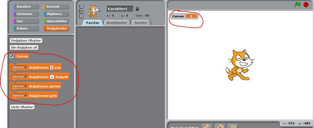 Şimdi de görüntü aşağıdaki gibi olacak. Kırmızıyla işaretlediğim seçenekler gelecek ve sahnede de değişkenimiz görünecek.