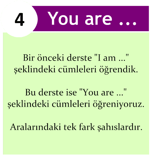 Bir önceki derste öğrendiğimiz “I am …” şeklindeki cümle kalıpları ile bu derste öğrendiğimiz “You are …” şeklindeki cümle kalıpları arasındaki tek fark şahıslardır. Önceki derste öğrendiğimiz cümle kalıbı birinci tekil şahsa göre olup, bu derste ikinci tekil şahsa yönelik bir kalıbı ele almaktayız.