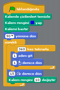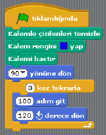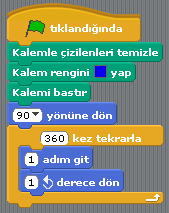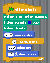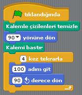 Program çalıştığında ilk olarak daha önce çizilmiş olan çizgileri temizleyecek. Karakteri sağ yöne (90 yönüne) doğru çevirecek. “Kalemi Bastır” komutu çizim yapılacağı için kullanılıyor. Karakter, bundan sonra hareket ettikçe çizim yapacak.