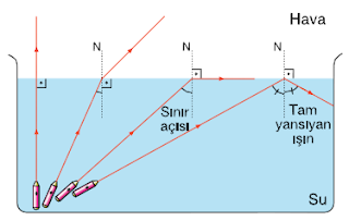 Işık ışınları sınır açısından daha büyük bir açı ile gönderilirse bu ışınlar ikinci ortama geçmez ve geldiği ortama aynı açıyla geri yansır. Bu olaya tam yansıma denir.