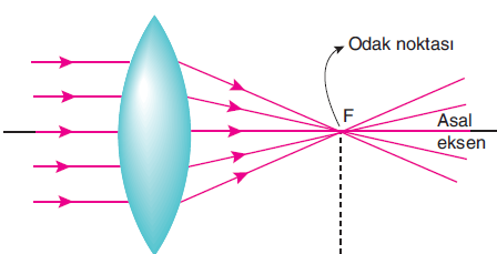 v  İnce kenarlı merceğe paralel olarak gelen ışınlar kırıldıktan sonra bir noktada toplanır. Işınların toplandığı bu noktaya ince kenarlı merceğin odak noktası denir.