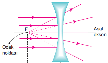 v  Kalın kenarlı merceğe paralel olarak gelen ışınlar bir noktadan çıkıyormuş gibi dağılarak kırılır. Kırılan ışınlarının uzantılarının kesiştiği noktaya kalın kenarlı merceğin odak noktası denir.