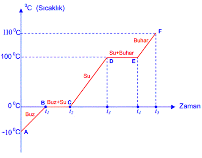 Suyun ısınma grafiği altta verilmiştir. Donma noktası 0 ° C, Kaynama noktası ise 100 ° C ‘dir. Suyun ısınma grafiğinin bölgelere göre incelenmesi aşağıdaki gibidir.
