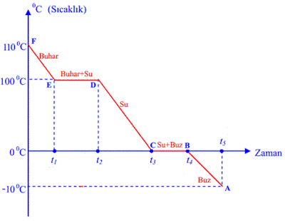Suyun soğuma grafiği altta verilmiştir. Donma noktası 0 ° C, Kaynama noktası ise 100 ° C ‘dir. Suyun soğuma grafiğinin bölgelere göre incelenmesi aşağıdaki gibidir.