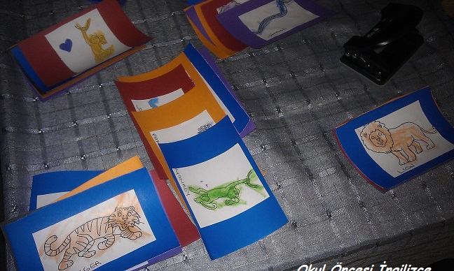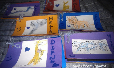 Tiger, Parrot, Lion, Monkey, Snake, Tiger gibi Jungle Animals konusunu öğrenirken çocuklara boyama yaptırdım. Sonra da boyadıkları resimleri kesip kartonlara yapıştırarak böyle minik bir kitap hazırladılar.