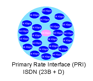 •PRI Her biri 64 Kbps’lik 30 adet B kanalı ve 64 Kbps’lık bir adet D kanalı içermektedir. Toplam 30* 64 + 1* 64 = 2.048 Mbps iletim sağlar. Bu ISDN standardının adı E1’dir.