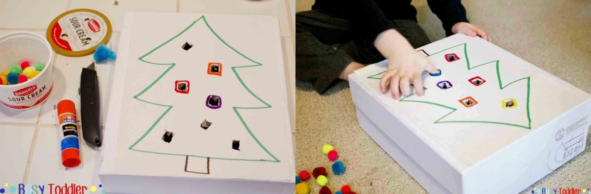 • Öncelikle çocuklarımızın bu ara her yerde gördükleri yılbaşı ağaçlarına dikkat çekebiliriz. Belki de en iyisi onlar çoktan sormuşlardır bile. Sonra ise kendi kutularımızın üzerine bir yılbaşı ağacı çizip üzerine de süslerimiz için bıçak yardımıyla delikler açıyoruz. Açtığımız deliklerin keçeli kalemlerle renk renk çerçevesini çiziyoruz.